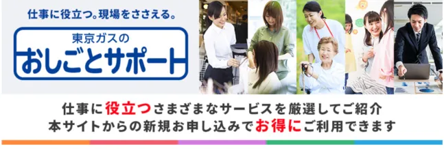 「東京ガスのおしごとサポート」は、「働くあなたのおしごとを支えたい」をモットーに、事業者の人材不足、行効率化、顧客満足向上などの課題解決に向け、さまざまな企業と連携しながら、法人のお客さまにとって魅力的なサービスを紹介するサイトです。