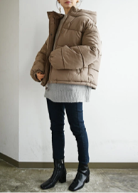 中綿たっぷりで暖かさ&軽さ抜群のショート丈のフェイクダウンコート。首元が暖かいスタンドカラーや、手首からの寒さを防ぐゴム入りの袖口のデザインも、真冬の防寒対策に有難い仕様となっています。旬のワイドシルエットと裏側のさらりとした生地感が、インナーのごわつきやもたつきの心配なく着こなせるのも大事な要素です。ボリュームフード×オーバーサイズ×コンパクトな丈感は、スキニーやロングスカート等、様々なボトムスとの相性も良く、この冬のマストアイテムになりそうです。
