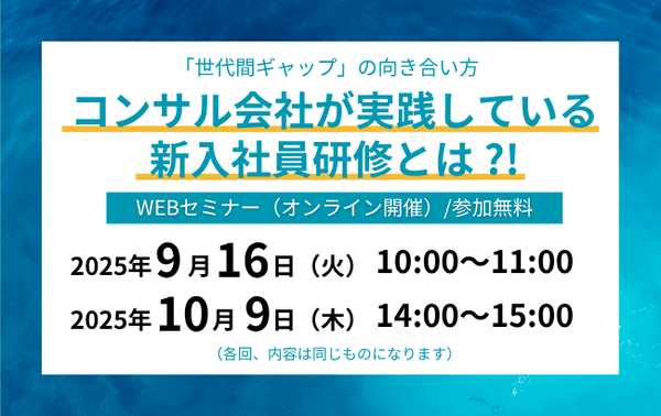 みらいコンサルティンググループ(本社:東京都中央区、代表:久保 光雄 岡⽥ 烈司)は、2025年9月16日・10月9日にセミナー『コンサル会社が実践している新入社員研修とは ?!』をWEBにて開催します。