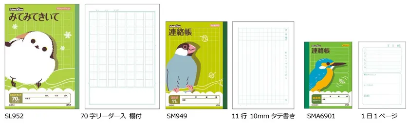 自由な発想で文章を記したり、先生や保護者との交流もできる「みてみてきいて」をはじめ、高学年向けのサイズと罫内容など、学年に応じて選べるラインナップになりました。