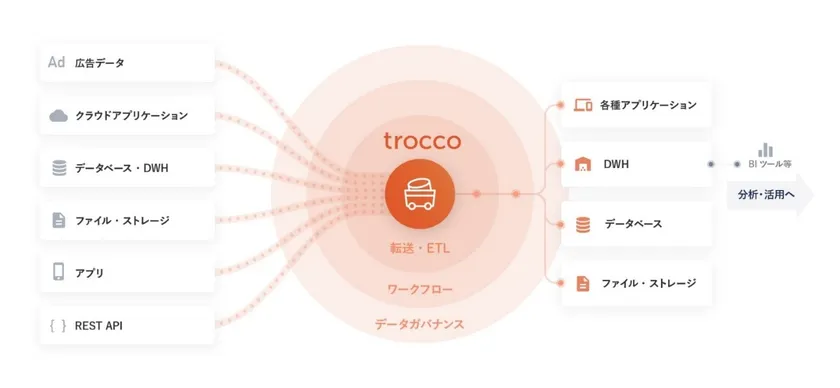 trocco(R)は、データの収集・加工・連携を自動で行い、点在しているデータを紐づけることで「より複雑で高度な分析」を可能にするETLのSaaSサービスです。完全日本語対応をしているという点において、日本企業のお客様にも安心してご活用いただけます。また、trocco(R)一つでGoogle BigQuery、Amazon Redshift、Treasure Data CDP、Snowflakeなど、約100種類複数のデータソースと接続が可能です。