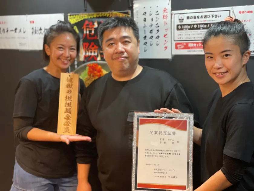 開業許可証授与式 左から富澤オーナー、中山代表、店長豆柴