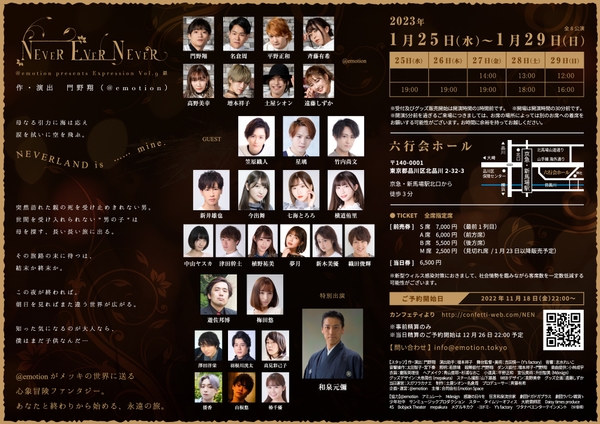 @emotion(代表:門野翔)主催、@emotion presents Expression Vol.9 銀『NEVER EVER NEVER』が2023年1月25日 (水) ~2023年1月29日 (日)に六行会ホール(東京都品川区北品川 2-32-3)にて上演されます。この度全キャストのビジュアル解禁が解禁され、初の大阪公演の決定も発表されました。