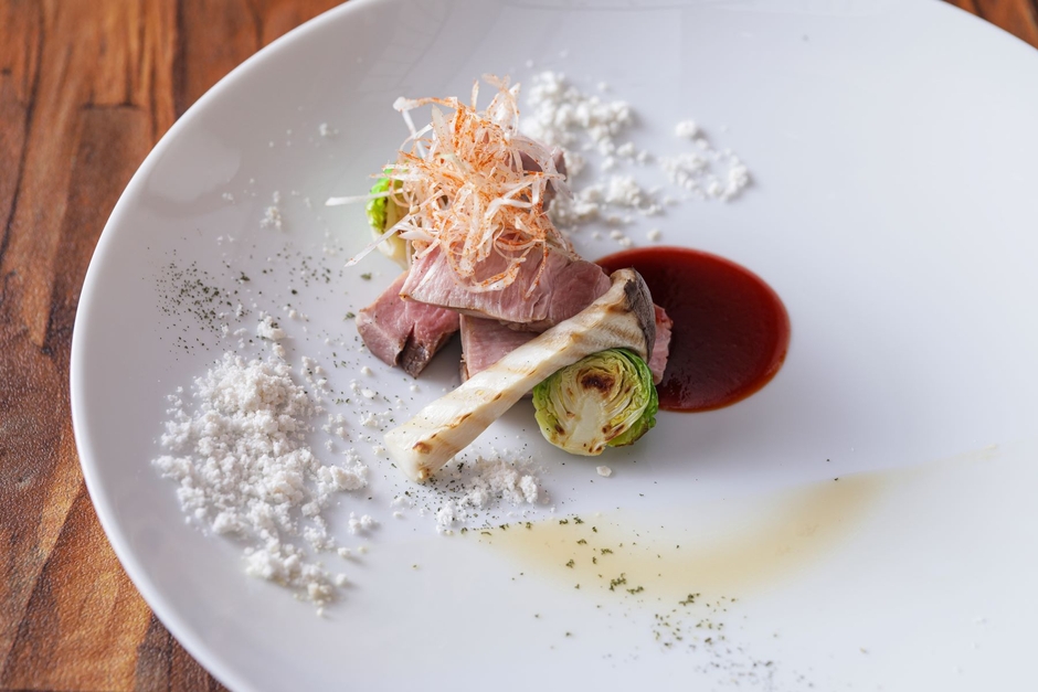 国産豚肩ロース肉のワインサムギョプサル風ごま油とエゴマのパウダー パジョリと共に