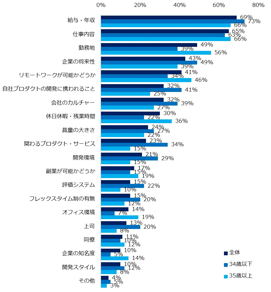★ エンジニアが転職先選びで重視するポイント、トップ3は「給与・年収」「仕事内容」「勤務地」。34歳以下のエンジニアはプロダクトやサービスの特性も重視する傾向。