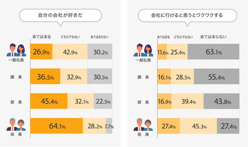 2020年3月に、法政大学大学院政策創造研究科・石山恒貴教授監修で行った中小企業に勤務しているビジネスパーソン1000人を対象にした「自社への“ファン度合い”に関する調査」で、自社へのファン度合いが「役員・部長」と「一般社員」の間で約20~40ポイントの開きがあり、会社を好きかどうか(自社ファン度)に大きな差があることが分かりました。