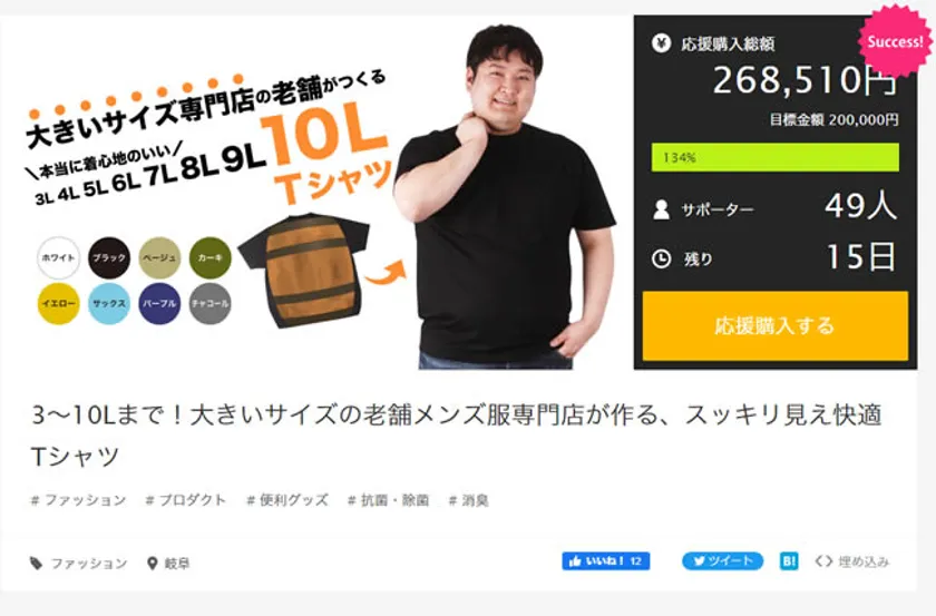 10LサイズまでのメンズTシャツをつくる応援購入サービス、 目標金額達成!Makuakeにて1/20までプロジェクト実施