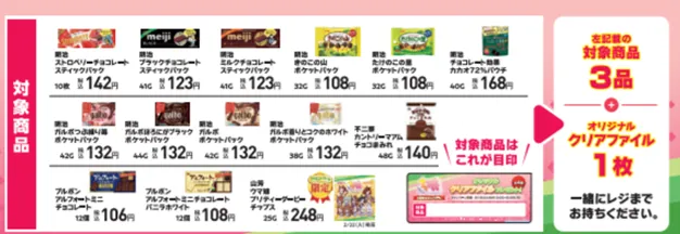 対象のお菓子を3個購入毎に、キャンペーン限定の描きおろしデザイン「A4クリアファイル」が1枚もらえます。