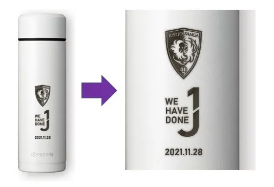 「いつでもどこでも“おいしい”一杯」がコンセプトの京セラ製CERAMUGボトル。その中でもポーチやポケットに入るコンパクトサイズ(180ml)に、京都サンガF.C.のエンブレムと昇格スローガン「WE HAVE DONE」、J1昇格を決めた日付(2021.11.28)を印字したオリジナルデザインのマグボトルです。ステンレスボトルの内面に施したセラミック塗膜加工により、スポーツ飲料にも安心してご使用いただけます。また、真空二重構造で冷たい飲み物も温かい飲み物も長時間、おいしい温度を保ちます。今回の京都サンガF.C. J1昇格記念オリジナルデザインでは、ホワイト、ブラックの2色をご用意しました。