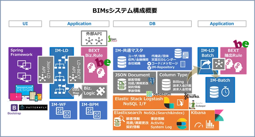 intra-martを基盤とし、ビジネスロジック作成ツール「IM-LogicDesigner」によるSOA・マイクロサービス定義の可視化と、B-Prostのビジネスルールエンジン「BEXT」を活用したことで、可視化されたノーコード、ローコード開発を可能。