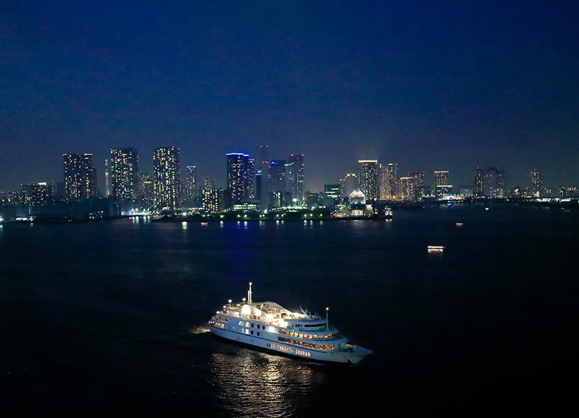 日の出ふ頭を22:40に出航し、お台場、東京ゲートブリッジ、羽田空港付近を通り、25:10に日の出ふ頭に帰航します。