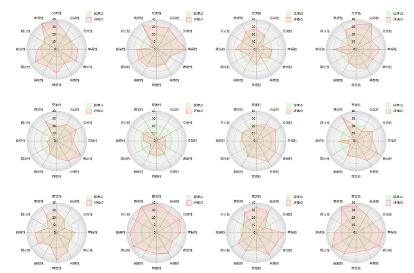 オンライン上で120の質問に自身で答えることにより、本人でさえ把握していない個性を12の尺度を用いて、レーダーチャートでグラフ化します。