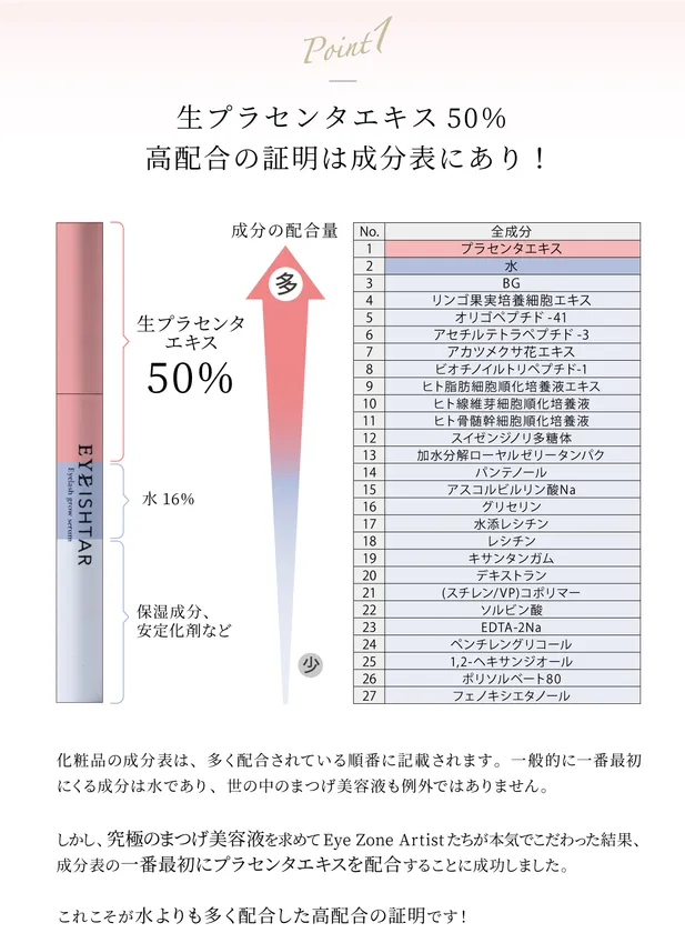 化粧品成分表は多く配合されている順番に記載されています。一般的には一番最初に来る成分は水ですが、本プロジェクトのまつげ美容液は、水よりも多い50%以上を生プラセンタを配合する事に成功した究極のまつげ美容液です。