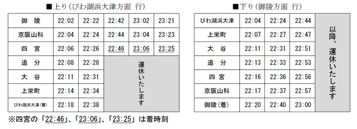 このたび、京津線(びわ湖浜大津駅~上栄町駅間)のレール交換作業において、騒音対策と働き方改革を踏まえ、深夜の工事回数を削減した効率的な工事をすることに伴い、下記のとおり、最終列車を含む深夜時間帯の一部列車を運休いたします。