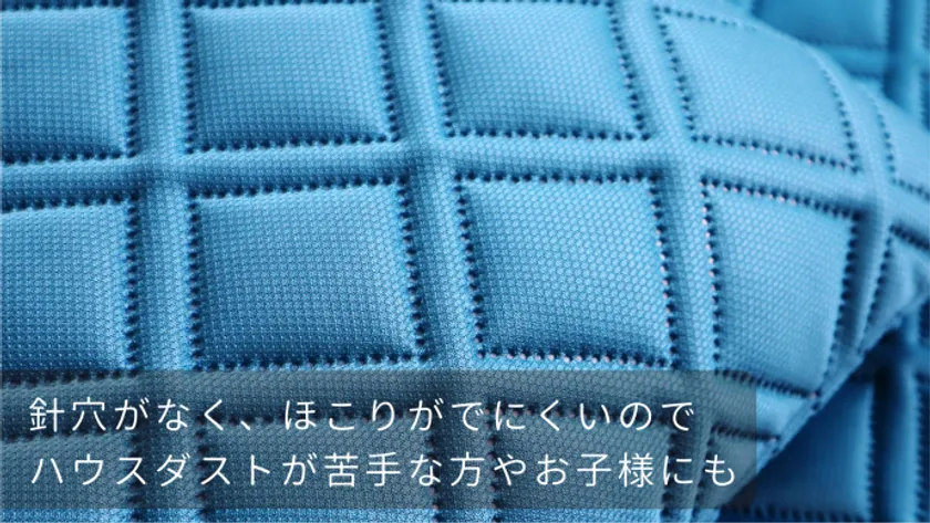 中材は樹脂製繊維でできており、綿や羽毛などを使用しないことでホコリの発生が抑えられます。 また、マットカバーは超音波キルティング加工により、針穴が開かずシームレスな仕上げなので、 気になる花粉やダニもブロック。 アレルギー体質の方やお子様にもおすすめです。