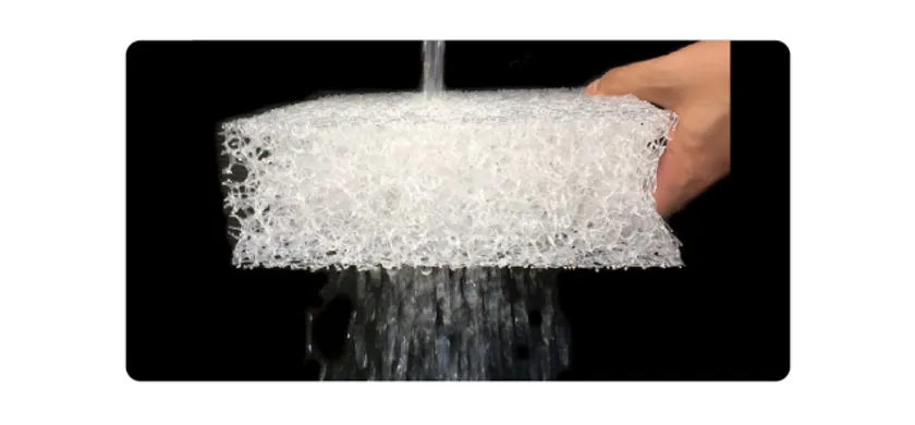 このマットの中材“カルファイバー”は特殊な立体網状構造で特許取得済みの素材。樹脂でできているカルファイバーは、綿や羽毛に比べ水分を吸収せず、匂いもつきません。また汚れや匂いが気になれば、カバーも中材も全て水洗いが可能なので、いつまでも清潔に気持ちよくお使いいただけます。