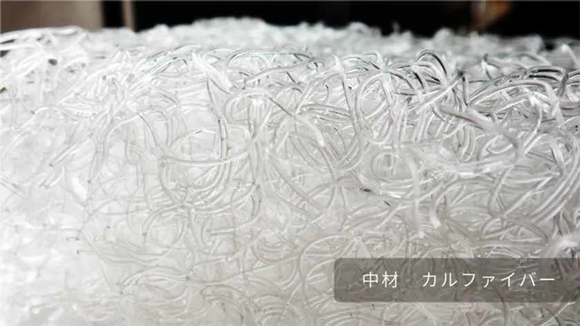 このマットの中材は、細い繊維状の樹脂(ファイバー)が積み重なった特殊なクッション材「カルファイバー(R)」を採用。繊維の重なりは点と点で接続され、立体的に重なり、絡み合うことで、独特のクッション性とスプリング性を生み出します。これが高弾力だけどしっかり体を受け止めることができる秘密。体の重さをマット全体に分散し、しっかり支えてしっかり受け止める。これが寝返りもしやすく、安定した姿勢で寝続けられる心地よさに繋がります。