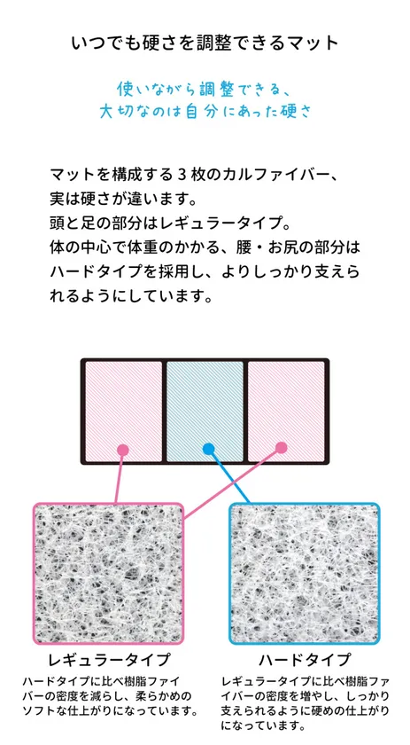 樹脂繊維の体積量(目付)を変更し、しっかり支えるハードタイプ、柔らかな寝心地のソフトタイプを使い分けています。