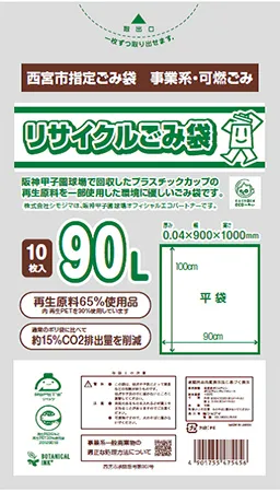 この「リサイクルごみ袋」は、同球場で回収されたプラスチックカップ10%のほか、ペットボトルを20%、ポリエチレンの再生原料を35%配合しており、再生原料65%とリサイクル率が高く、通常のポリ袋に比べCO2排出量を約15%削減できる製品です。