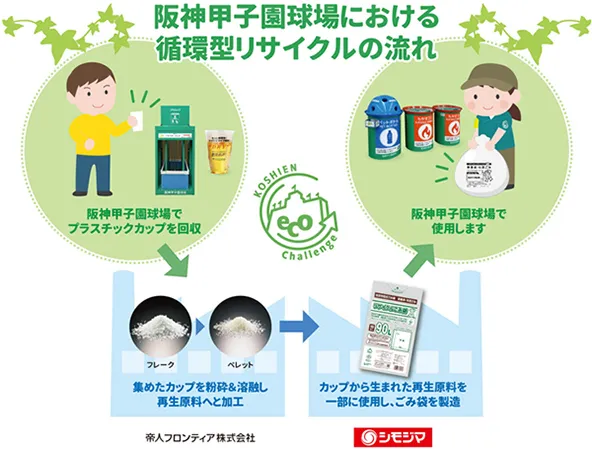 この度、本プロジェクトの一環として、阪神甲子園球場オフィシャルエコパートナーである株式会社シモジマ(本社:東京都台東区、社長:笠井義彦)とともに、阪神甲子園球場で回収したプラスチックカップの再生原料を一部使用した「リサイクルごみ袋」を開発し、2022年のシーズンから同球場で使用する、循環型リサイクルの取組みを開始しますのでお知らせします。