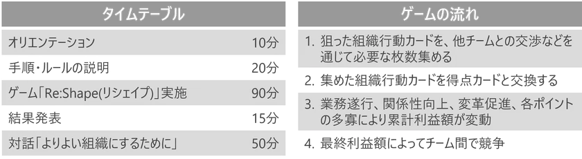 全体で約3時間程度のプログラム。主に、約130分のゲームパートと、約50分の対話パートに分かれます。ゲームパートは、チーム間で競争する組織運営シミュレーションです。業務遂行・関係性向上・変革促進の3つの要素が含まれる組織行動カードを集めて実行することで、組織の業績向上につながります。ゲーム中の期末ごとに示されるデータを基に、マニュアルの整備、1 on 1の実施、外部環境の分析など、カードに記載された組織行動が結果にどのような影響を与えるのかを推察します。3つの要素のバランスを考えながら運営することがポイントです。バランスを取りそこなうと、成長が鈍化したり、場合によっては赤字に転落してしまったりすることもあります。