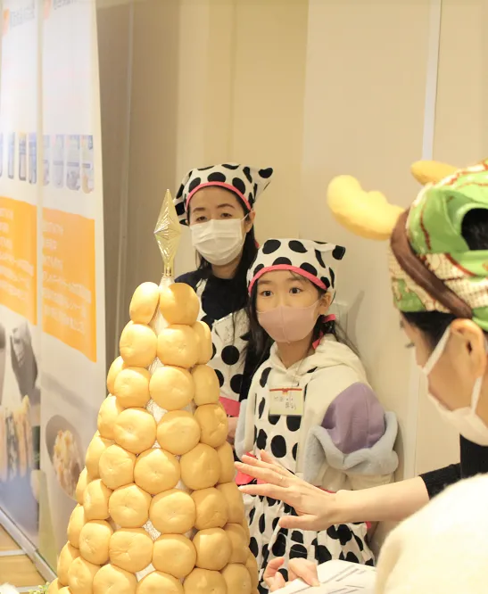 もう一つのケーキは、米粉パンで作ったツリーに子ども達が順番にデコレーションして、最後は上から粉砂糖を雪のように降らせて、みんなの力で巨大なクリスマスケーキが完成。見上げるほどのツリーケーキに子ども達の歓声が上がりました。