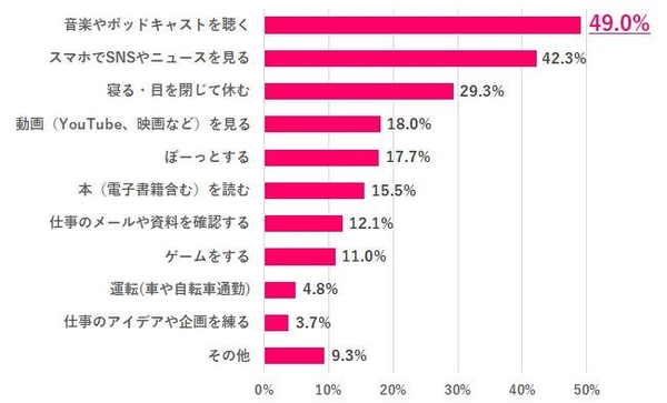 通勤時間は何をしているか聞いたところ、1位「音楽やポッドキャストを聴く」49.0%、2位「スマホでSNSやニュースを見る」42.3%、3位「寝る・目を閉じて休む」29.3%でした。その他のコメントでは、「勉強」や「買い物」がありました。
