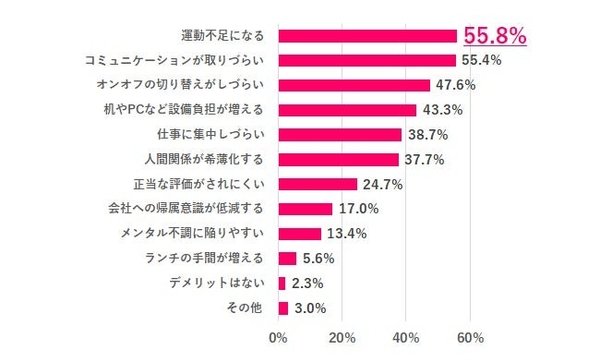 一方で、リモートワークのデメリットとして過去の同調査では、「運動不足になる」(55.8%)、「コミュニケーションが取りづらい」(55.4%)を問題視する声が多数を占めました。