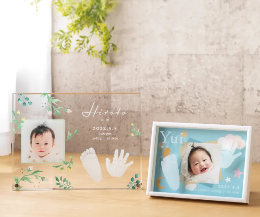 赤ちゃんの小さな手足形のサイズをそのまま再現し、かわいくデザインされたアートフレーム。
