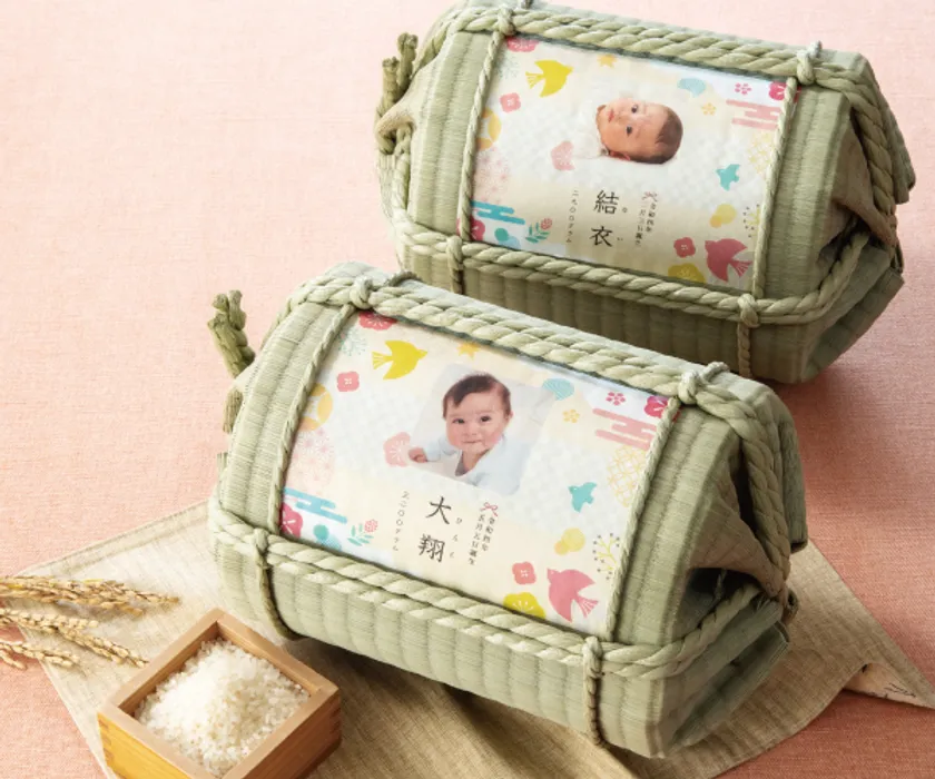 赤ちゃん出生時の体重分のお米を、写真入りパッケージに入れてお届け。まるで赤ちゃんを抱っこしているような気持ちになれる、ご両親・祖父母向けのアイテムです。い草俵と米袋の2種類からお選びいただけます。
