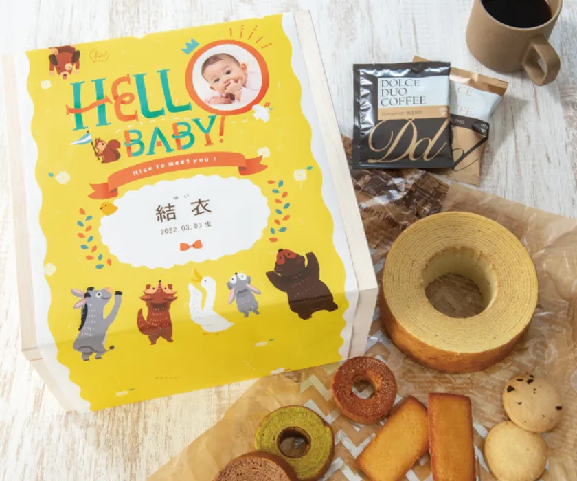 HELLO BABY!の文字の中に赤ちゃんのお顔がのぞく、ユニークでかわいいデザイン。木箱に様々な種類の焼菓子やコーヒーが詰め込まれたボリューム満点のアイテムなので、友人や親戚の方におすすめです。