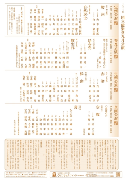 国立能楽堂(東京都渋谷区千駄ヶ谷4-18-1)の9月主催公演が下記の通り上演されます。