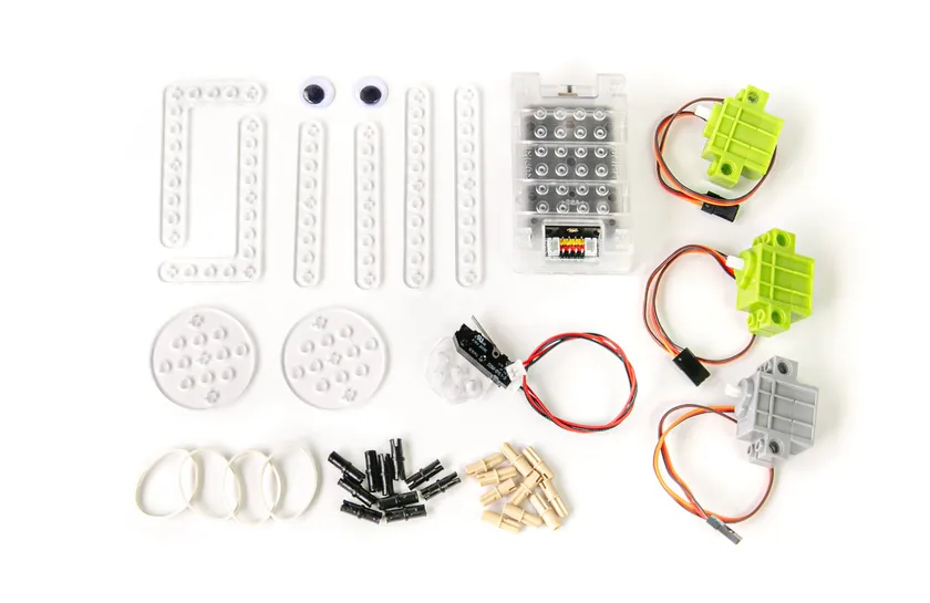 ユカイ工学株式会社の開発した「ユカイなパチパチブロックキット」は、ブロックとフレームの組み立てで複数のタイプのロボットを作ることができる、動くロボットづくりの第一歩に最適なロボットキットです。アルスクール株式会社の提供するプログラミング教材「アルスパーク」と「ユカイなパチパチブロックキット」を連携することにより、アルスパーク上で、キットを使って組み立てたロボットの動きをプログラミングすることが可能となりました。