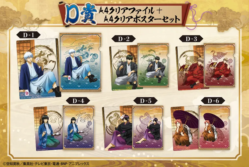 東西南北と中央を守護する5つの神獣を銀魂キャラクター六人それぞれに組み合わせ、神獣のワンポイントが入っている着物を身にまとった銀さん達の粋な表情や格好は必見です!