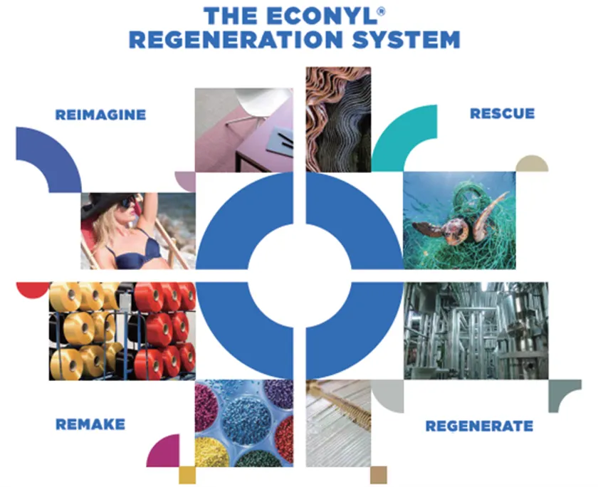 ECONYL(R)は、イタリアのテキスタイルメーカーであるAquafil社が開発した再生ナイロン糸で、廃棄された漁網やカーペット生地の端材など100%廃棄物を原料としています。