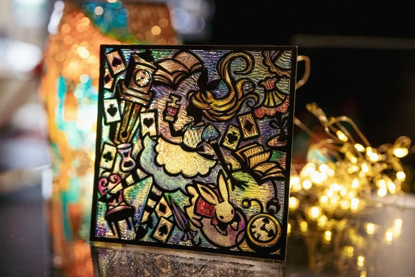 刃物そのものではなく、刃物を用いた新しいものを作ろうという発想から生まれた「シャインカービング」は、彫刻刀でビニールシートを彫って作る、関市発祥の新しいアートです。元となるのは柔らかいビニールシート。表に白黒でデザインが印刷されており、裏にはカラーフィルムを貼り付けてあります。シートの表面を彫ることで、裏側のフィルムの色が浮き出てくる仕組みとなっています。彫刻刀によって生まれるデコボコした彫り跡はキラキラと光を反射し、さながらステンドグラスのような非常に美しい質感に仕上がります。