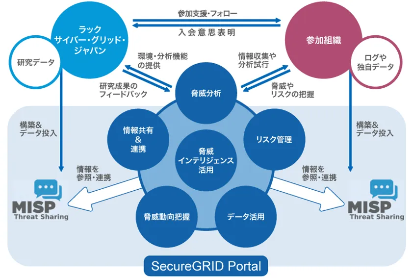 SecureGRIDアライアンスは、ラックが開発したWebポータル「SecureGRID Portal」を介しオープンソースの情報共有プラットフォームである「MISP(Malware Information Sharing Platform)」に蓄えた脅威情報の共有・連携を行います。SecureGRIDアライアンスを活用して自組織のセキュリティ強化に役立てる取り組みを行えるだけではなく、当研究所の研究成果を利用したり、脅威分析・検証の研究推進に参画したりできるなど、脅威情報の共有・連携の新しいカタチを創出する研究プロジェクトとも言えます。このため、参加組織には脅威情報相当のデータとそのデータが蓄積された連携対象のシステムとしてMISPをご用意いただき、アライアンスにご参加いただきます。
