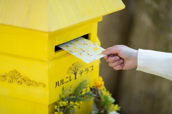 ミモザの花言葉は「感謝」。イベントでは、感謝の気持ちを綴るイベント限定のオリジナルポストカードを用意します。星野エリア内の4つの店舗でドリンクやスイーツ等を購入すると、カードを受け取ることができます。店舗の入り口にあるミモザを使用した黄色いフラワーリースが目印です。書き綴った手紙をカフェスペースにある黄色いポストに投函すれば、ポストカードに記載してある送付先にお届けします。ポストカードは、軽井沢で活動するデザインとクラフトのブランド「chaledo(チャレド)」とのコラボレーションにより制作しました。