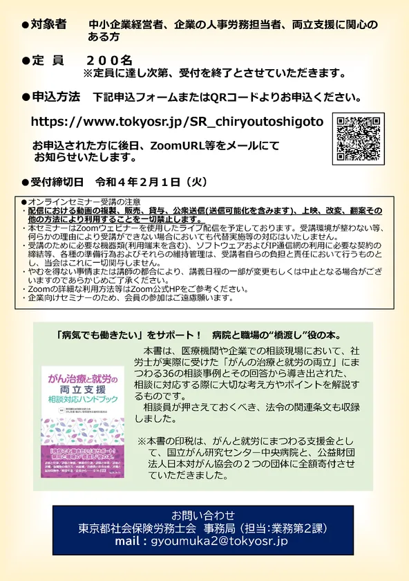 東京都社会保険労務士会(会長:寺田 晃)は、社会貢献事業の一環として中小企業経営者、企業の人事労務担当者、両立支援に関心のある方を対象に「治療と仕事の両立支援セミナー」をオンラインで開催します。
