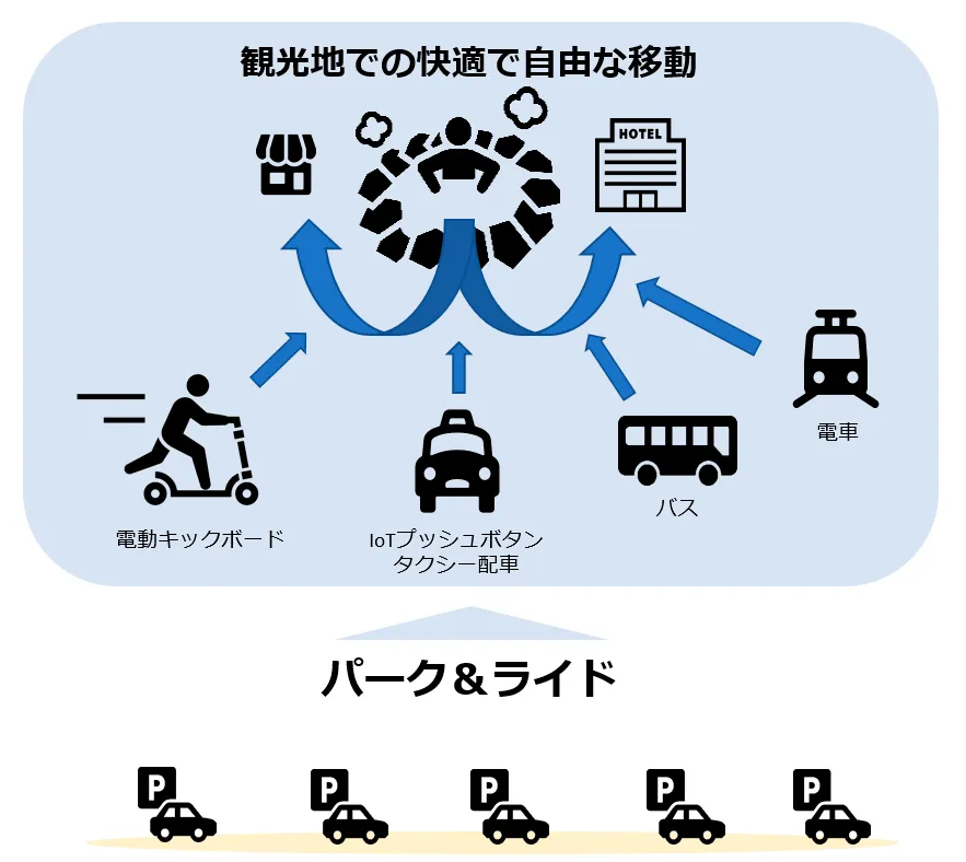 湯布院宮尻パーキングから、電動キックボードのシェアリングやIoTプッシュボタンによるタクシー配車を利用し観光地へ移動する。