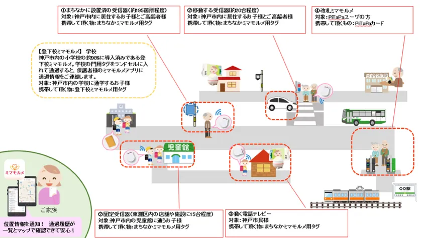 福島での実証実験と並行して、阪急阪神ホールディングスグループの阪神ケーブルエンジニアリング株式会社(本社:兵庫県西宮市、代表取締役社長:藤井 啓詳)、アイテック阪急阪神株式会社(本社:大阪市福島区、代表取締役社長:清水 正明)及び株式会社ミマモルメ(本社:大阪市福島区、社長:小坂 光彦)と連携し、神戸市が市内で技術実証・実装を支援する「Be Smart KOBE」プロジェクトの令和3年度「AI・IoT等を活用して社会課題解決を目指す事業」の実施企業に選定され、10月18日より『ICTを活用したお子様とご高齢者様の見守り』に関する実証事業も進行しています。