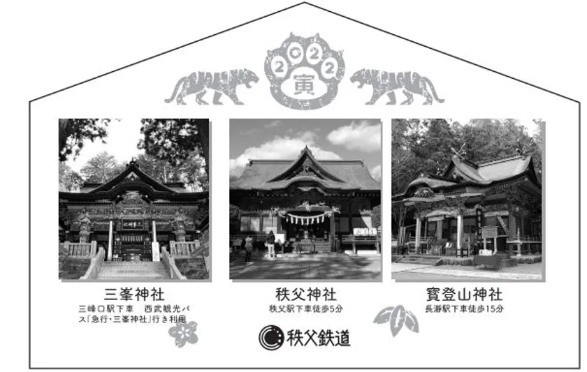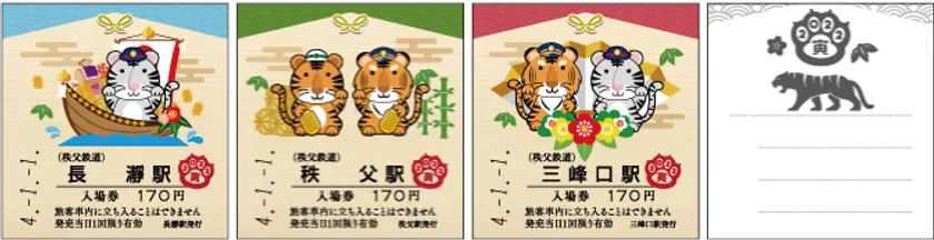 2022年干支の『寅』をモチーフにした、カラー硬券入場券です。硬券の裏面には、お願い事が書けるようになっています。また、台紙は絵馬型になっており、表面には急行開運号のイラストがデザインされ、裏面には秩父三社を紹介しています。