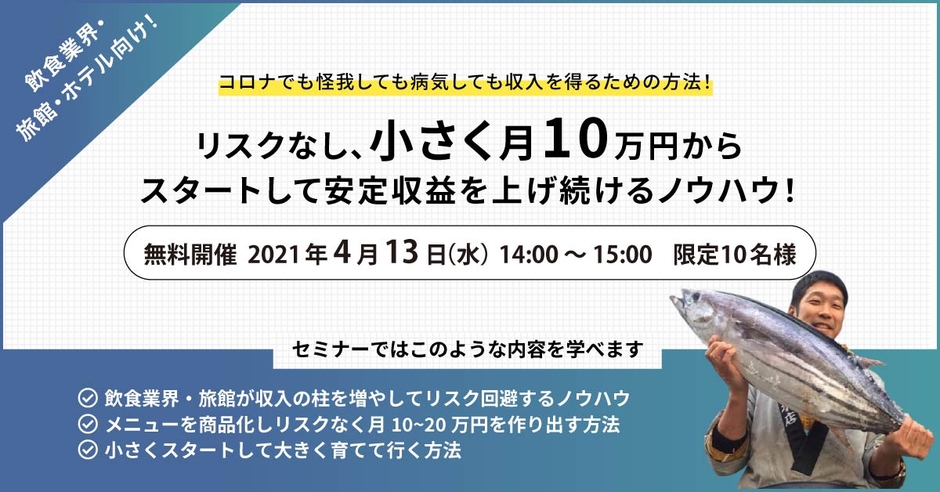 飲食業界・旅館・ホテル向け! リスクなし、小さく月10万円からスタートして安定収益を上げ続けるノウハウセミナー!
