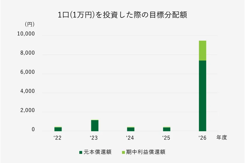 「SOLMINA再エネファンド nonFIT1号」の目標利回りは4.66%で設定しており、1口(1万円)を投資した際の目標分配額は下図の通りとなります。