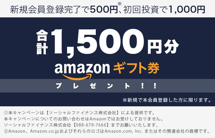 1月21日から2月28日まで、最大1,500円分のアマゾンギフト券がもらえる『初回投資応援キャンペーン』を開催いたします。
