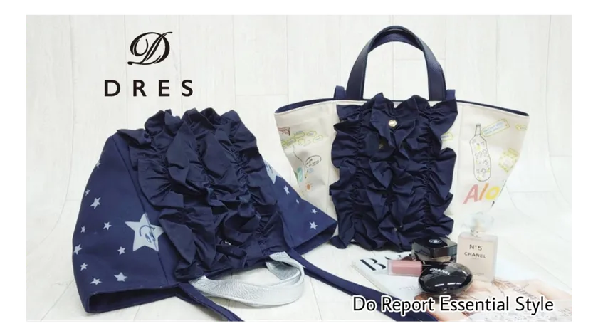 フロントにフリルをあしらい、持ち手部分はレザーを使用したDRESオリジナルプリントのトートバッグが登場。