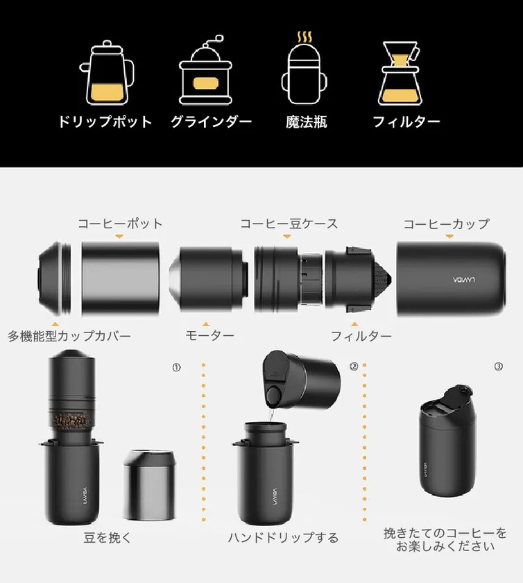 ATONCEは、たった一つの構成で新鮮なコーヒーを飲むようにコンパクトに設計されたスマートな製品です。ケトル+モーター+グラインダー+フィルター+コーヒーカップで構成されており、特別な追加の製品なしですぐにコーヒーを粉砕して抽出することができます。いつでも、どこでも、5分以内に、新鮮な香りとお気に入りの味を楽しむことができます。