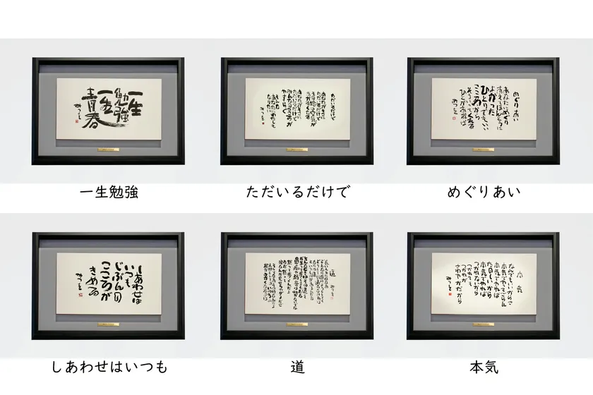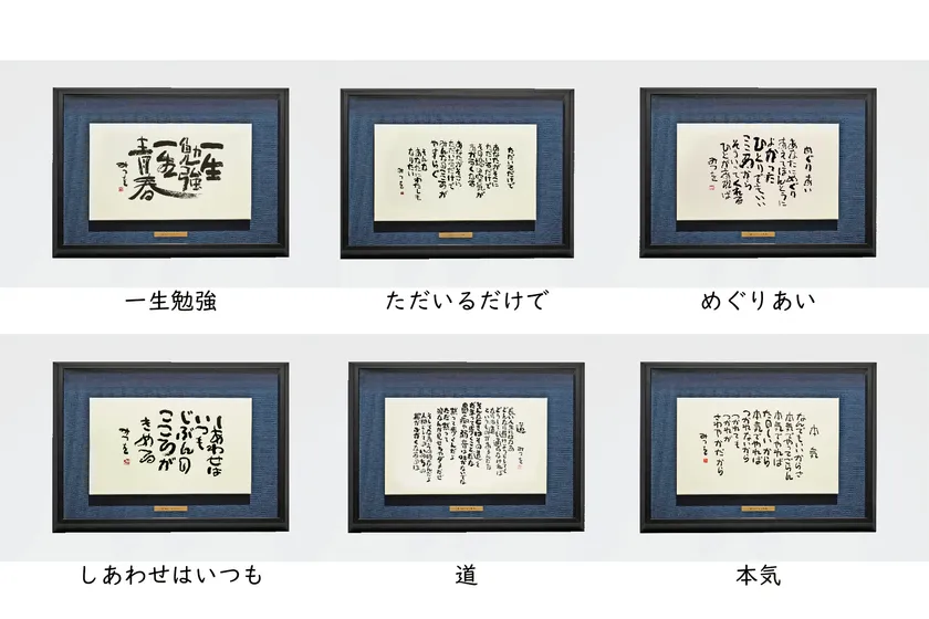 ・相田みつを美術館での人気上位6作品「道」「一生勉強」「本気」「めぐりあい」「ただいるだけで」「しあわせはいつも」を採用。