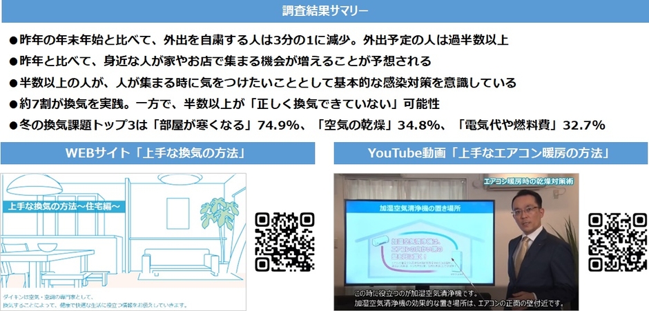 こうした課題が人が集まる場所での換気の実践の妨げにならないよう、換気時に室内の快適性を大きく損なわない工夫が大切です。そこで当社は、WEBコンテンツ「上手な換気の方法」(https://www.daikin.co.jp/air/life/ventilation)やYouTube公式チャンネルの動画「上手なエアコン暖房の方法」(https://www.youtube.com/watch?app=desktop&v=LgAfBLOYqxQ&t=2s)で、冬の換気時の室温低下を抑える工夫や節電の工夫、冬の室内の効果的な乾燥対策をご紹介しています。