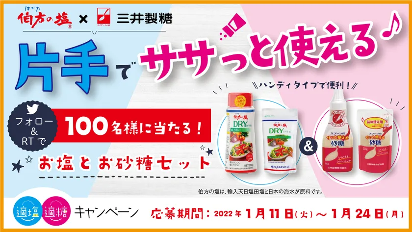 伯方塩業株式会社(本社:愛媛県松山市、代表取締役社長:石丸 一三)と三井製糖株式会社(本社:東京都中央区、代表取締役社長:森本 卓)は、「適塩適糖キャンペーン」を開催します。第1弾となるTwitterキャンペーンは、塩の日である2022年1月11日(火)スタート!片手でササっと使えるお塩とお砂糖セットを抽選で100名様にプレゼントします。